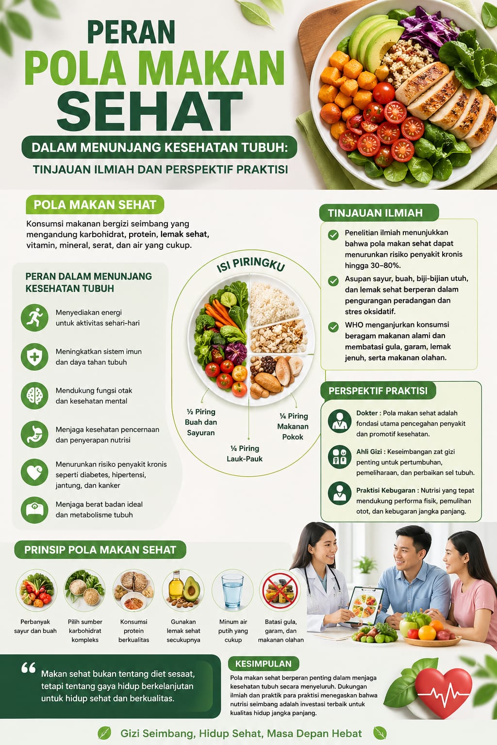 Kesimpulannya, pola makan sehat merupakan salah satu faktor paling penting dalam menunjang kesehatan tubuh secara menyeluruh. Dukungan dari penelitian ilmiah dan rekomendasi para praktisi kesehatan menunjukkan bahwa pola makan yang baik mampu meningkatkan kualitas hidup, mencegah penyakit, dan memperpanjang usia harapan hidup. Oleh karena itu, kesadaran masyarakat untuk menerapkan pola makan sehat harus terus ditingkatkan sebagai bagian dari upaya preventif dalam menjaga kesehatan, baik pada tingkat individu maupun masyarakat luas.