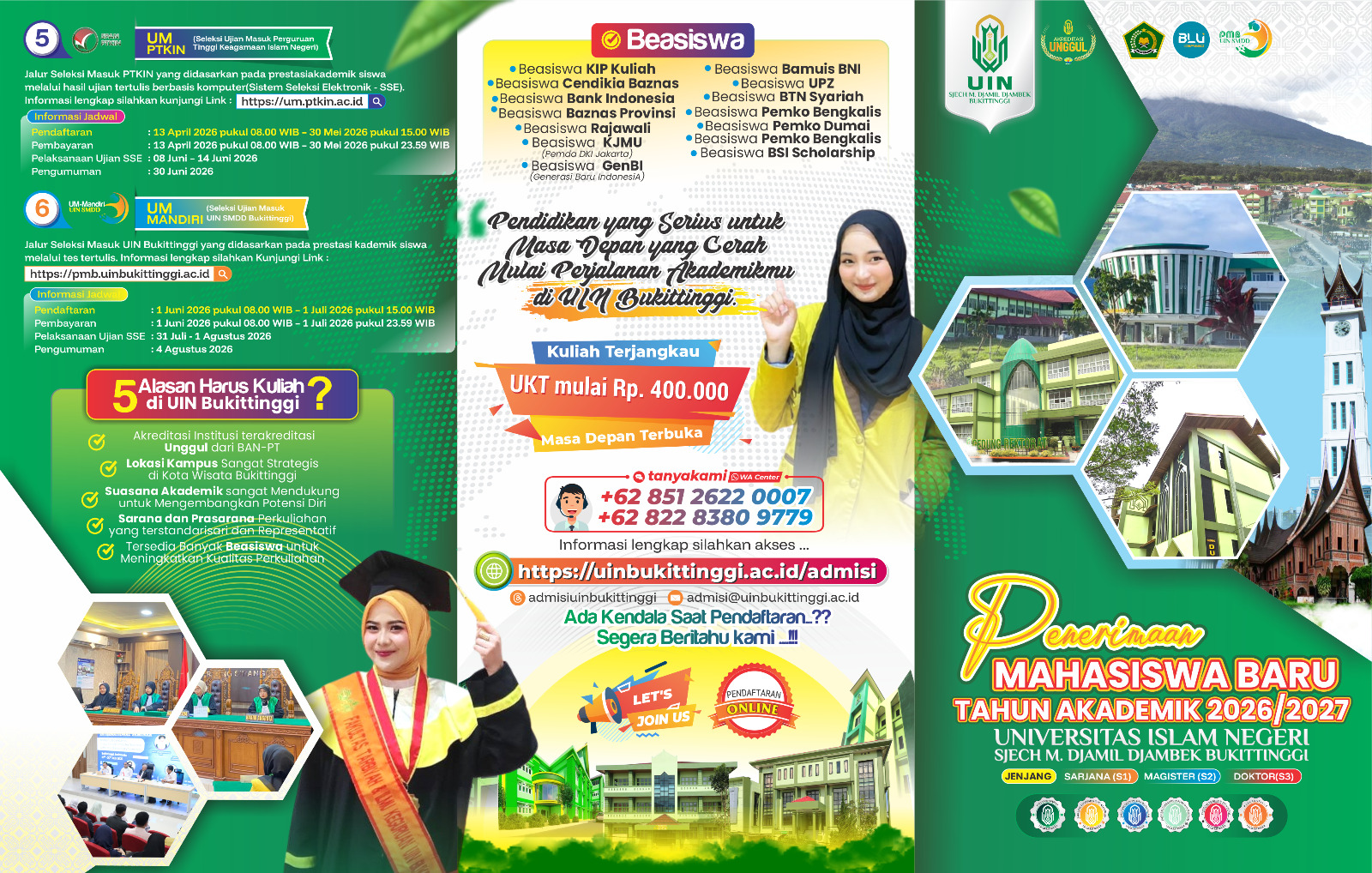 Penerimaan Mahasiswa Baru (PMB) Tahun Akademik 2026/2027 di Universitas Islam Negeri Sjech M. Djamil Djambek Bukittinggi (UIN Bukittinggi) resmi dibuka. Momentum ini menjadi kesempatan emas bagi generasi muda untuk melanjutkan studi di kampus yang terus bertumbuh sebagai pusat keilmuan Islam, sains, dan sosial humaniora yang adaptif terhadap perkembangan zaman.